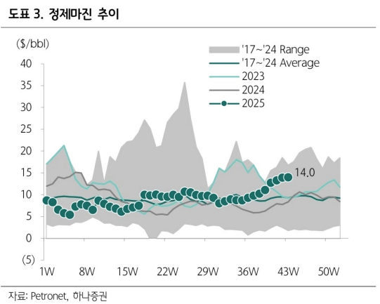 - 하나증권은 보고서를 통해 정제마진이 강세를 보이고 있다며, 2Q25 아시아 평균 정제마진은 9.5$/bbl 이었으나, 현재 정제마진은 14$/bbl 수준으로, QoQ +4.5$/bbl 개선되었다고 밝힘. 연말~연초 현재 수준의 정제마진이 유지될 가능성이 높다고 판단하며, 2026 년에도 정제마진 강세는 불가피하다고 언급. 중기적으로 2025~26 년 글로벌 정제설비 순증설은 매년 30~50 만 b/d 수준에 불과해, 수요 증분 80~100 만 b/d 를 하회하고, 단기적으로는 러시아의 드론 공격에 따른 정제설비 타격으로 러시아 휘발유, 디젤 수출 통제가 현실화되고 있다고 설명. 아울러, 미국은 정기보수 시즌임에도 불구하고 가동률이 90%를 상회한다며, 자국 내 공급 부족 현상 때문이고, 이에 따라 수출량이 감소하고 있고 언급. 정제마진 강세 지속 시 정유업체의 실적 추정치는 추가로 상향될 것으로 전망
