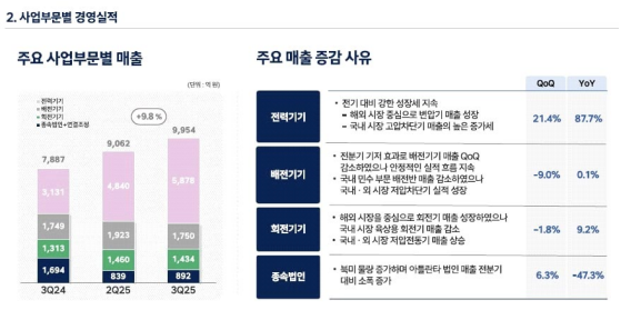 - 먼저, 22 일 실적을 공시한 LS 일렉트릭은 3 분기에 매출액 1 조 163 억원과 영업이익 1,008 억원을 기록했으며, 매출액은 전년동기대비 19.1% 증가했고, 영업이익은 같은기간 51.7% 증가. 주력 사업인 글로벌 전력사업에서 북미 데이터센터와 초고압 변압기 성장이 이어지며 실적 신장을 견인했으며, 특히 3 분기 현재 수주잔고는 총 4 조 1,000 억원으로, 전분기대비 2,000 억원 증가했음. 아울러, 금융정보업체 에프앤가이드에 따르면, 효성중공업은 3 분기에 매출 1 조 4,008 억원(이하 yoy +22.3%), 영업이익 1,546 억원(+39.1%)을 기록했을 것으로 예상되고 있으며, HD 현대일렉트릭은 매출 1 조 120 억원(+28.3%), 영업이익 2,339 억원(+42.8%)을 기록했을 것으로 추정되고 있음. 업계에서는 북미와 유럽의 노후 전력망 교체 수요와 데이터센터 전력 인프라 확충 등에 따른 대형 프로젝트 수주가 이어진 덕분으로 분석되고 있으며, 특히 변압기와 함께 차단기 수요가 동반 증가하는 점도 주목되고 있음