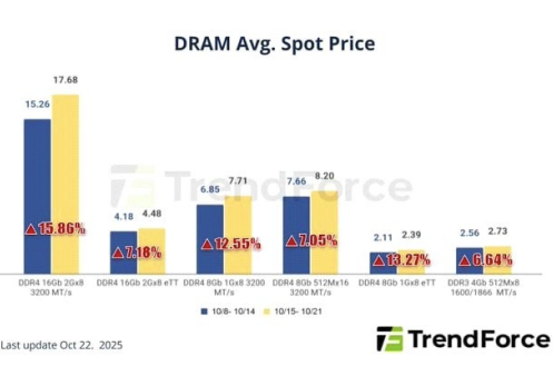 - 이에 따라, 현물 시장은 가격과 거래량이 동반 상승하는 강세 흐름을 보이고 있다. 대표적인 주요 제품인 DDR4 1Gx8 3200MT/s 칩의 평균 현물 가격은 지난주 미화 7.219 달러에서 이번 주 7.931 달러로 9.86% 상승했다.