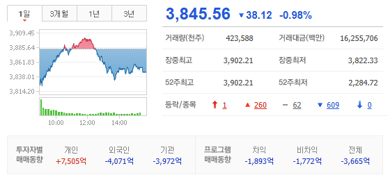 - 코스피는 -47.89pt 하락한 3,835.79pt 로 출발. 외국인 현선물 매도, 기관 현물 매도, 선물 매수 출발. 반도체/소부장 하락 출발한 가운데, 희토류, 요소수, 비철금속, 전선/전력기기, 방산, 화장품, 미용기기, 정유, 석유화학 등 상승 출발