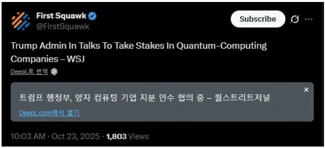 :양자) 트럼프, 국가 전략 산업 일환 양자컴퓨팅 기업 지분 확보 방안 검토 소식(WSJ). 관련 테마 강세
