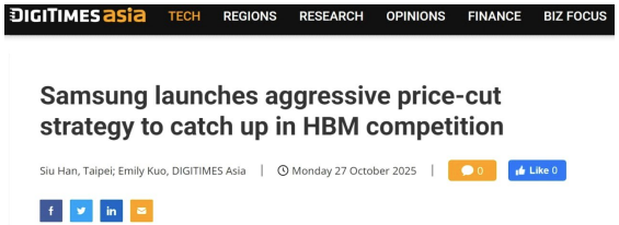 - digitimes 보도에 의하면, 삼성전자는 늦게 진입한 HBM 시장에서 점유를 빠르게 차지하기 위해 낮은 가격을 제시하고 있다고. HBM3E 는 30%, HBM4 는 6~8% 가량 낮는 가격을 제시하고 있는 것