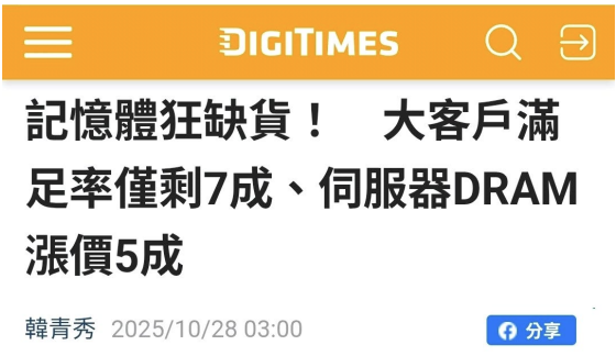 # 메모리 대란! 대형 고객사 물량 충족률 70%로 급락, 서버 DRAM 가격 50% 급등