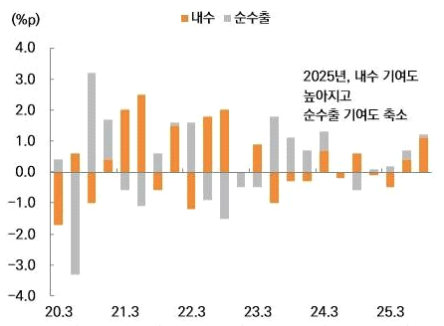 :순수출 기여도 축소 중이나, 소비쿠폰 시행 및 추경 영향에 2025 년 내수의 성장률 기여도 확대