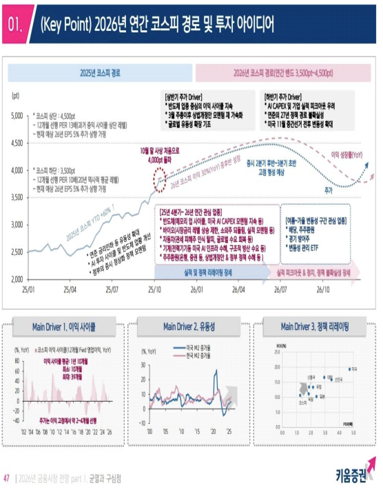 1) 반도체 중심의 코스피 이익 상승 사이클, 2) 글로벌 유동성 확대, 3) 정부의 증시 정상화 정책 등 “실적 + 유동성 + 정책”의 구심점이 2026 년 주식시장에 선순환 효과를 부여할 전망