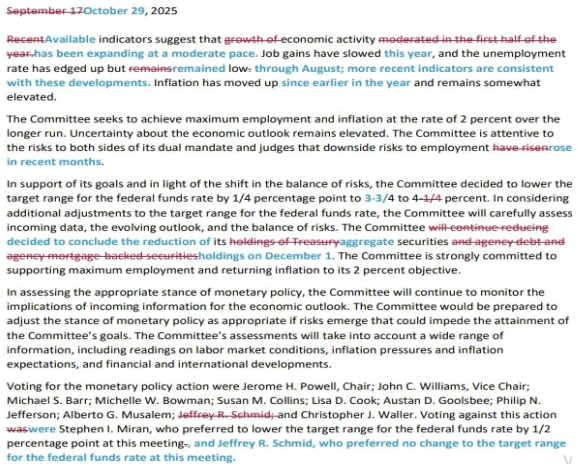 :FOMC 3.75~4.00%로 25bp 인하. 연준 내 의견 분열 심화. 파월, 12 월 추가 인하 선긋기. 양적 긴축 종료