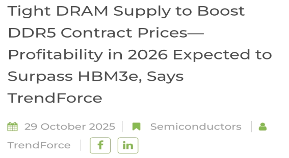 # (by TrendForce) DRAM 공급 부족으로 DDR5 계약가격 상승 지속, 2026 년에는 HBM3e 수익성 추월 전망