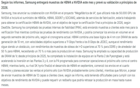 - 보도에 따르면 삼성전자는 이달 NVIDIA 에 HBM4 샘플을 공급하고, 2026 년 초 검증을 완료할 예정임.