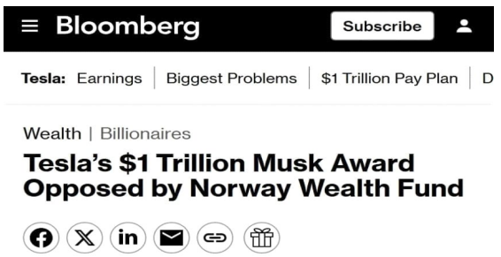 - 지난밤 뉴욕증시가 인공지능(AI) 거품 논란에 따른 주요 기술주들이 약세를 보인 영향 속 3 대 지수 모두 하락 마감한 가운데, 테슬라가 일론 머스크 최고경영자(CEO)에게 최대 1 조달러 규모의 주식 보상을 지급하는 안을 표결에 부치는 주주총회를 앞두고 부정적인 소식이 이어지면서 5.15% 급락했음. 이와 관련, 세계 최대 규모인 노르웨이 국부펀드가 오는 6 일(현지시간) 예정된 테슬라 주총에서 머스크에 대한 주식 보상안에 반대표를 던질 것이라는 소식이 전해짐. 전 세계 약 9 천개 기업에 투자하는 노르웨이 국부펀드는 테슬라 지분도 약 1.1% 소유해 테슬라의 10 대 주주 중 하나로, 노르웨이 국부펀드는 머스크의 남다른 능력과 그가 창출해낸 가치는 인정한다면서도, 전례없이 큰 규모의 보상 지급에는 우려를 표했음