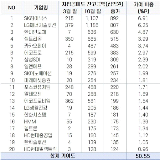 - 증가한 차입공매도 잔고 금액 약 13 조원 중, 절반은 Top 20 기업의 기여가 컸음