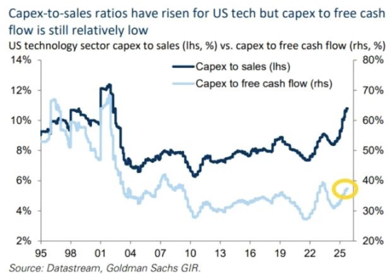 # 골드만삭스에 따르면 미국 기술주의 설비투자(capex) 대비 매출 비율은 닷컴버블 이후 최고 수준에 도달했으나, 설비투자 대비 잉여현금흐름 비율은 여전히 낮은 수준이라고 발표