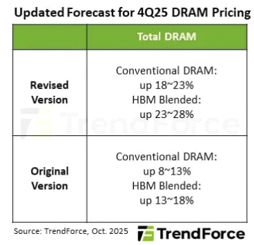 - 기존 4분기 DRAM 가격 상승 전망치인 8~13%에서 18~23%로 상향 조정했다.