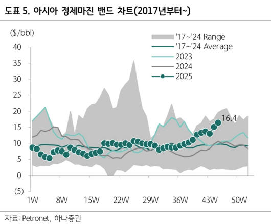 - 이와 관련, 정유업계 관계자는 "OPEC+ 증산 속도 조절과 러시아 제재 등 글로벌 정세 변화 속에서도 정제마진이 안정적인 흐름을 보인다"며, "계절적 성수기 효과까지 더해지면서, 4 분기에도 국내 정유사들의 견조한 실적 개선세가 이어질 것으로 보인다"고 밝힘