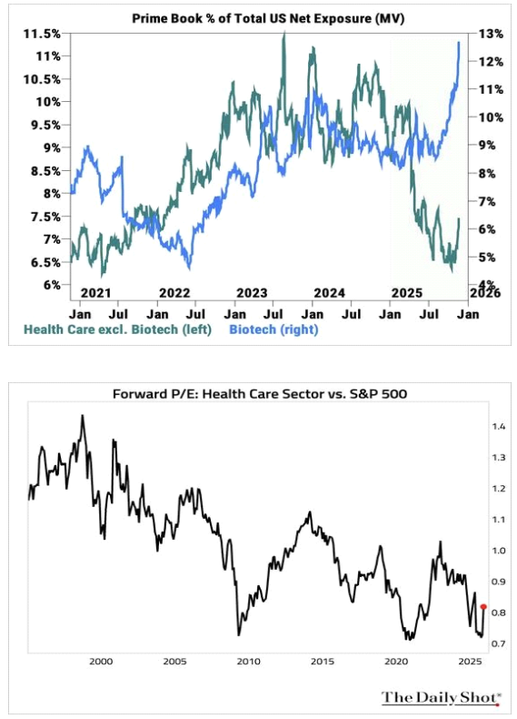 • 수급(Flows): 지난주 골드만삭스 프라임 브로커리지 고객들의 순매수 1 위 섹터 등극. 특히, 5 년 내 가장 강력한 매수세(Long-buying)가 유입되었으며, 이를 바이오테크(Biotech)가 주도함 (두 번째 차트)