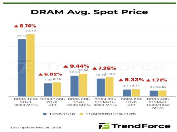 # DRAM 현물 가격은 전 제품군에 걸쳐 상승 특히, DDR4 8Gb(1Gx8 3200 MT/s) 제품이 9.44% 오르며 상승세를 주도