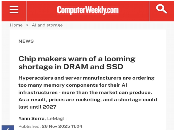- AI 인프라 수요 폭증으로 DRAM, HBM, NAND 칩 수급이 공급을 초과하고 있다.