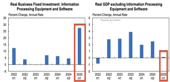 :2025 년 상반기 미국 GDP 성장의 90% 이상을 AI 관련 하드웨어·소프트웨어 투자가 견인했으며, 비(非)AI 부문은 거의 제자리거나 오히려 위축(바클레이스 자료). 첨부된 차트에서 보듯 AI 투자만 급등하고, AI 를 제외하면 GDP 증가폭은 미미한 수준
