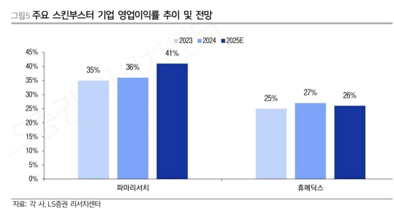 - LS 증권은 국내 미용의료기기 시장은 꾸준히 우상향하는 내수 수요에 인바운드 수요가 더해지면서, 성장세가 가팔라지 는 중이라고 분석. 국내 대표 미용 의료기기 회사의 내수 매출 성장률에서도 알 수 있듯, 노화에 따른 수요 증가, 얼리 안티에이징 수요 확대, 남성의 시장 참여 등으로 2021 년~2025E 내수 매출액 CAGR 은 파마리서치 +30%, 클래시스 +40%를 기록하며 구조적으로 성장 중이라고 밝힘. 여기에, 2025 년부터는 인바운드 피부과 소비금액이 월평균 915 억 원(+73% yoy) 더해지면서, 내수 시장 성장은 더욱 가속화되는 흐름이라고 설명