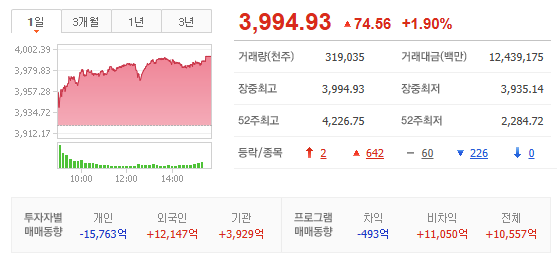- 코스피는 +18.72pt 상승한 3,939.09pt 로 출발. 외국인 현물 매도, 선물 매수, 기관 현물 매수, 선물 매도 출발. 자동차/타이어, 카지노, 유리기판, 조선, 호텔리조트/항공/여행, 조선기자재, 해운, 온디바이스 AI, 피팅/밸브, 전선/전력설비, 자율주행, 화학섬유/정유, 은행, IT 대표주, 음원/음반, 로봇 등 상승 출발