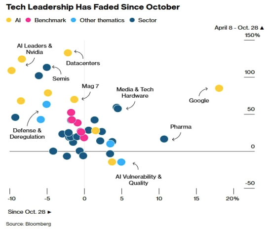# (by TVM 알파) AI·빅테크가 단기 피로 구간(밸류 부담 + AI 수익성 의문)에 들어가면서 헬스케어·디펜시브 업종으로 로테이션 발생 중. 그러나, AI 데이터센터 CapEx 성장률이 견조해 완전한 장기 추세 전환은 아님 → “일시적 스타일 로테이션 가능성 높음.