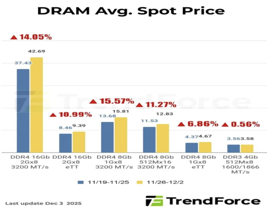 현재 현물 가격의 변동성이 상당히 큰 가운데, DDR4 칩 가격은 계속해서 오르고 있습니다. 전반적으로 DDR4 의 호가(Quote)는 여전히 DDR5 보다 높게 형성되어 있습니다. 현물 가격이 이미 매우 높은 수준임에도 불구하고, 하락할 조짐은 전혀 보이지 않고 있습니다. 주력 제품인 칩(즉, DDR4 1Gx8 3200MT/s)의 평균 현물 가격은 지난주 14.914 달러에서 이번 주 16.514 달러로 10.73% 상승했습니다.