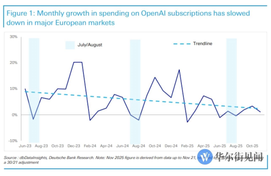 •도이체방크 자료에 따르면, 유럽에서 ChatGPT 사용자 수는 계속 증가하고 있지만, 유료 구독자 증가 속도는 둔화되는 추세. 유료 구독은 OpenAI 핵심 수익원 중 하나이기에 성장 둔화는 새로운 수익 모델 확보가 시급함을 의미함. 업계가 주목하던 광고 모델 도입 역시 상황이 복잡해짐