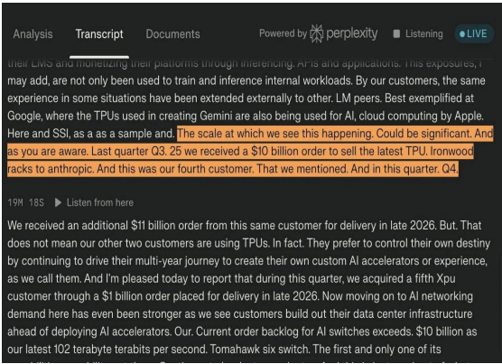 "지난 분기(2025 년 3 분기)에 우리는 Anthropic Games Store 에 최신 TPU Ironwood 랙을 판매하는 100 억 달러 규모의 주문을 받았습니다. 이번 분기에는 동일 고객으로부터 2026 년 말 납품 예정인 110 억 달러 규모의 추가 주문을 받았습니다." "하지만, 그렇다고 해서 다른 두 고객이 TPU 를 사용하고 있다는 의미는 아닙니다. 사실, 그들은 수년간 진행해 온 맞춤형 AI 가속기 개발을 통해 스스로의 운명을 개척해 나가기를 원합니다."