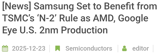 # 삼성전자, 해외에서 최첨단 공정을 생산하는 것이 제한될 수 있다는 TSMC의 N-2 규정으로 수혜받을 전망. AMD와 Google, 미국 내 삼성전자 테일러 공장의 2nm 생산 검토