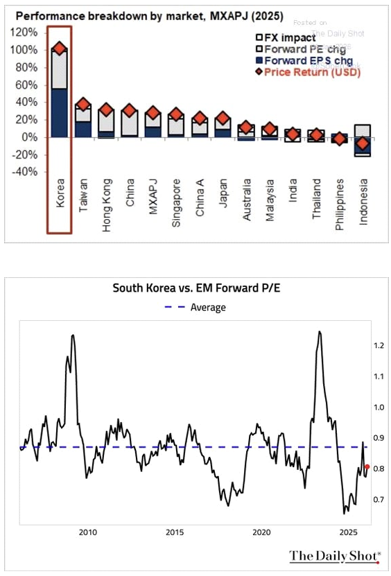 - 자동차/로봇 업종 강세. CES 2026에서 보스턴다이내믹스의 휴머노이드 로봇 ‘아틀라스’ 완제품 양산계획 공개. 현대차그룹의 AI 로보틱스·자율주행 확장 전략이 구체화되면서, 현대차, 현대오토에버, 현대모비스 등 계열사와 두산로보틱스 등 로봇 기업들의 상승 재개