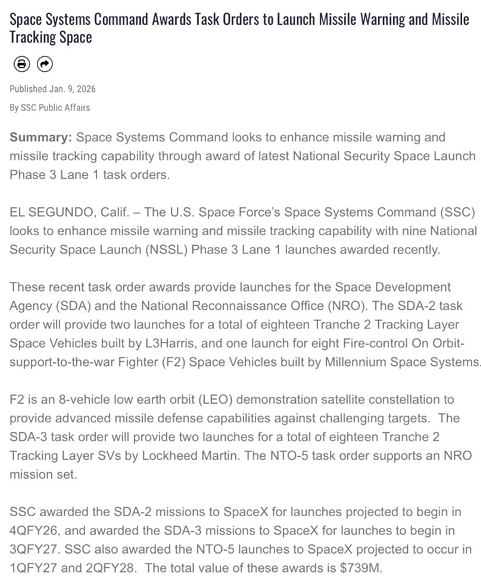 :미 우주군 우주시스템사령부(SSC)는 최신 국가 안보 우주 발사(NSSL) 3단계 레인 1(Phase 3 Lane 1) 과업 지시를 통해 미사일 경보 및 미사일 추적 능력을 강화하고자 합니다.