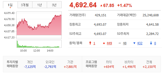 - 코스피는 +37.65pt 상승한 4,662.44pt 로 출발. 외국인 현선물 매도, 기관 코스피200 매수, 선물 매도 출발. 반도체/소부장 상승 출발한 가운데, 자동차, 초전도체, 인터넷, 전선/전력설비, 나트륨이온, 로봇, 유리기판, 의료AI, 폴더블폰, 자율주행, 통신, 탈플라스틱, IT대표주, 리튬 등 상승 출발