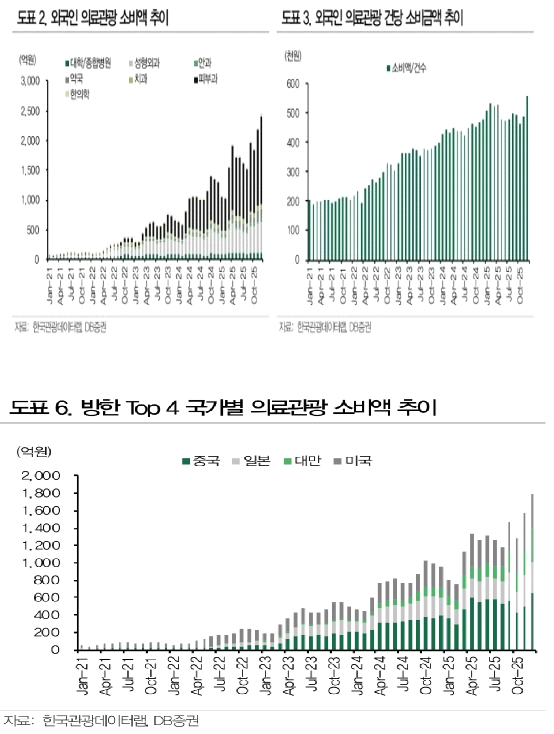 - DB증권은 보고서를 통해 2025년 의료관광 소비액은 2조 797억원(+65.3% YoY)으로 의료 미용 중심 성장세가 뚜렷했다며, 특히 2025년12월 의료관광 소비액은 2,443 억원(+10.6% MoM, +85.8% YoY)으로 11 월에 이어 역대 최대치를 경신했다고 밝힘. 동월 피부과 소비액 역시 1,483억원(+14.9% MoM, +107.6% YoY)으로 11월에 이어 사상 최고치를 경신했다고 언급. 관광 및 의료 미용 성수기 효과, K-Beauty 선호도 상승, 원화 약세에 따른 외국인 체감 의료비 부담 감소 등으로 높은 성장세를 달성한 것으로 분석