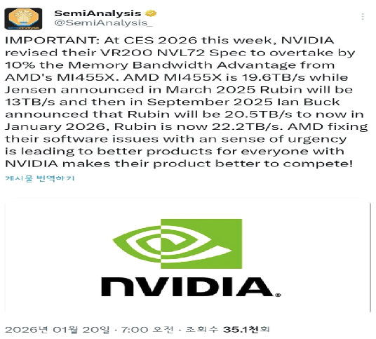 - 엔비디아 VR200 NVL72의 메모리 대역폭 상향조정 내역 2025 년 3월 13TB/s 2025 년 9월 20.5TB/s 2026 년 1월 현재 22.2TB/s (AMD MI455X 는 19.6TB/s)