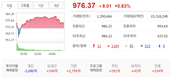 - KOSDAQ 은 주도주 차익실현에 KOSDAQ 으로 수급 유입되며 KOSPI 대비 아웃퍼폼. 연초 KOSDAQ 시장 주도했던 로봇주 차익실현. 그간 소외됐던 바이오텍·2차전지 강세와 함께 980p 돌파