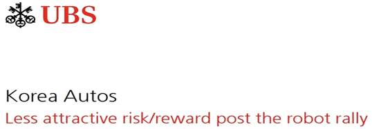 # Korea Autos (UBS) Less attractive risk/reward post the robot rally 현대자동차, 기아, 현대모비스